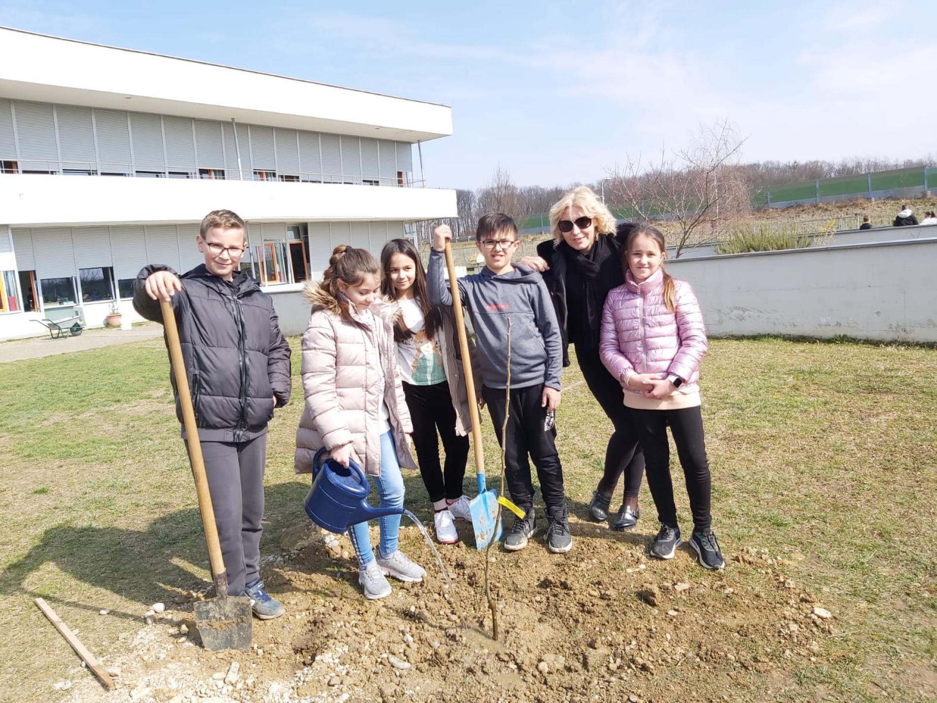 Učenici 4. razreda pod vodstvom učiteljica Martine Delišimunović Čmigović, Ivane Vlajčić, Natalije Kovač i Danijele Dujić, a u sklopu projekta Udruge za zaštitu prirode i okoliša “Zasadi stablo ne budi panj” posadili su u našem školskom vrtu četiri voćke : šljivu , krušku, trešnju i jabuku!