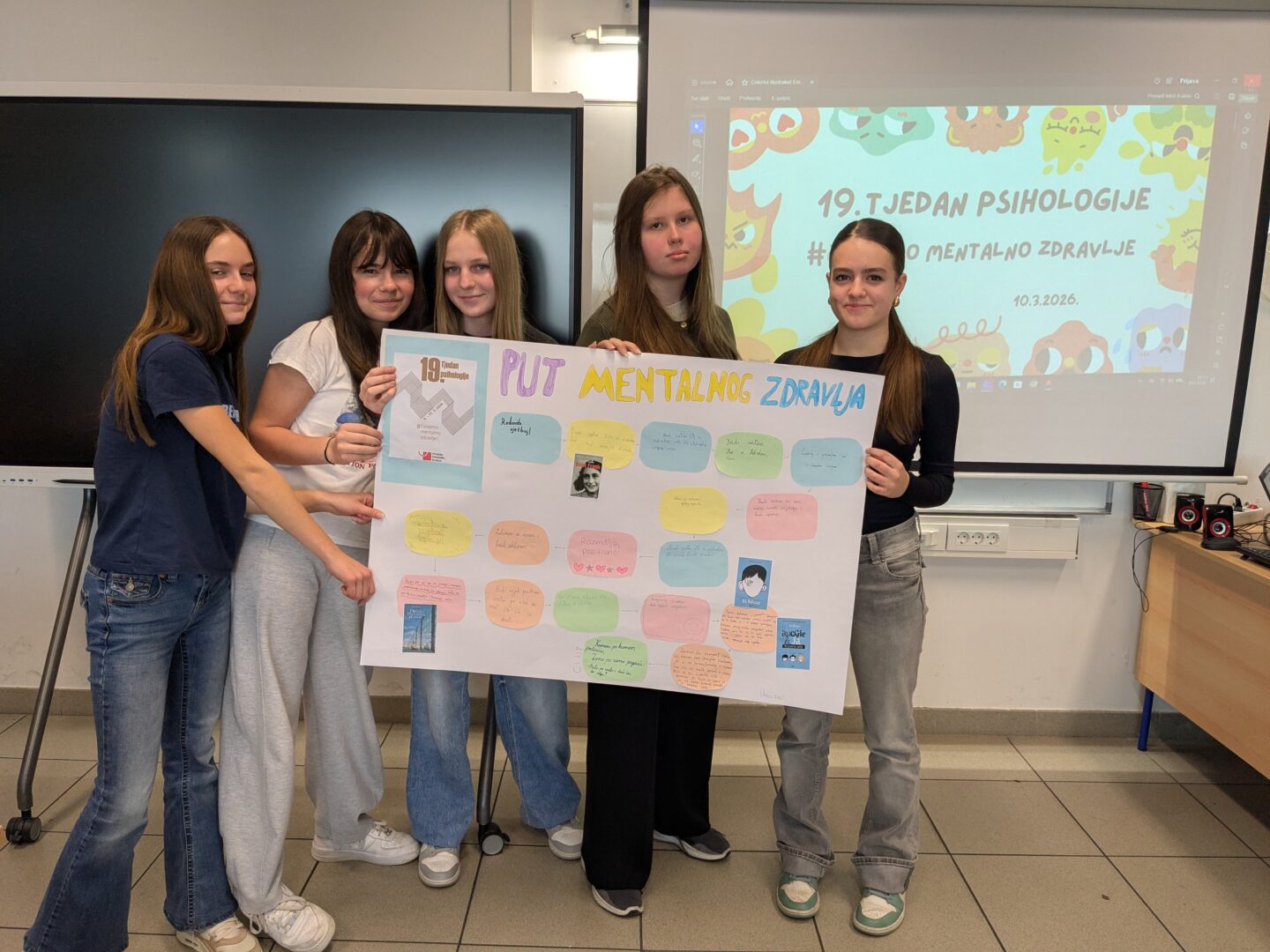 Učenicima je psihologinja prikazala važnost i strategije uspješnog očuvanja mentalnog zdravlja, knjižničarka im je pomogla odabrati knjige koje su s razrednicom analizirali pronalazeći njihovu ulogu u uspješnom nošenju sa životnim izazovima. Izradili su plakat “Put mentalnog zdravlja” koristeći „kamenčiće“ koje su ispisali pozitivnim i poticajnim porukama.